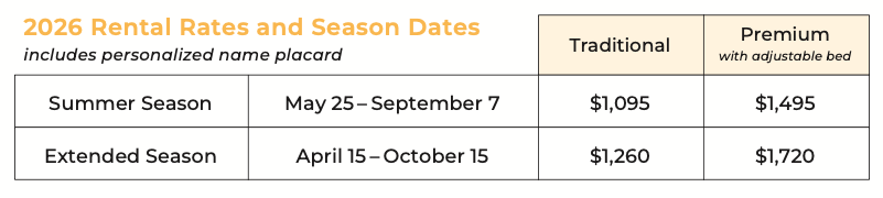 | Summer Camp | Traditional Cabana – Summer Season Rental | 05/25/2026 – 09/07/2026 M T W Th F S Th 08:00 AM to 08:00 PM | $1095.00 – Member $1095.00 – Guest | ENROLL |